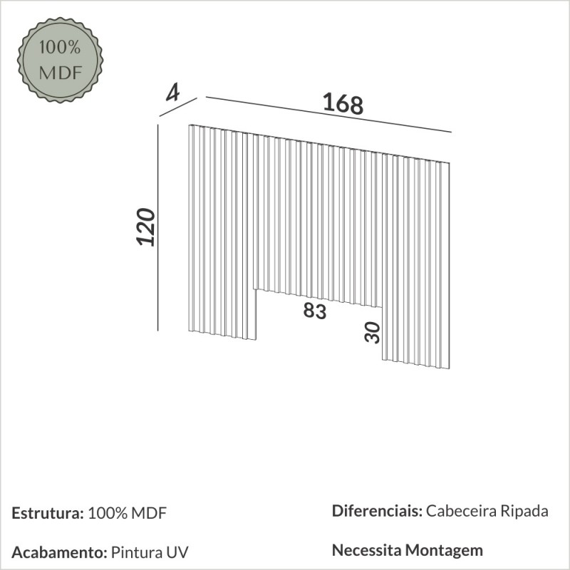Ripados milimetricamente pensados e matérias primas de alta qualidade, fazem com que esse produto seja um acessório bonito e durável para a sua cama. Este produto conta com um corpo 100% MDF, que proporciona um isolamento nas noites frias e úmidas de inverno. Seu design é atemporal e esbanja modernidade e aconchego em qualquer dormitório.
