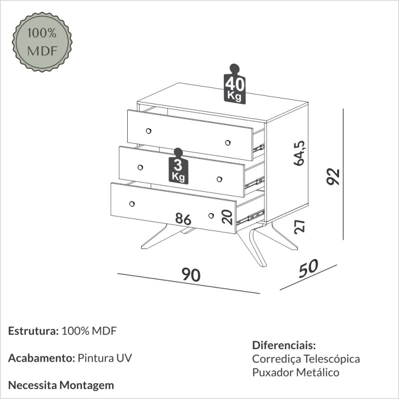 Pintura UV com 6 camadas de proteção e matérias primas de alta qualidade, fazem com que esse produto seja um acessório bonito e durável para a seu dormitório. A Cômoda Retrô conta com pés e corpo 100% MDF, que proporcionam um excelente acabamento e alta durabilidade. Esse acessório possui gavetas espaçosas e funcionais.