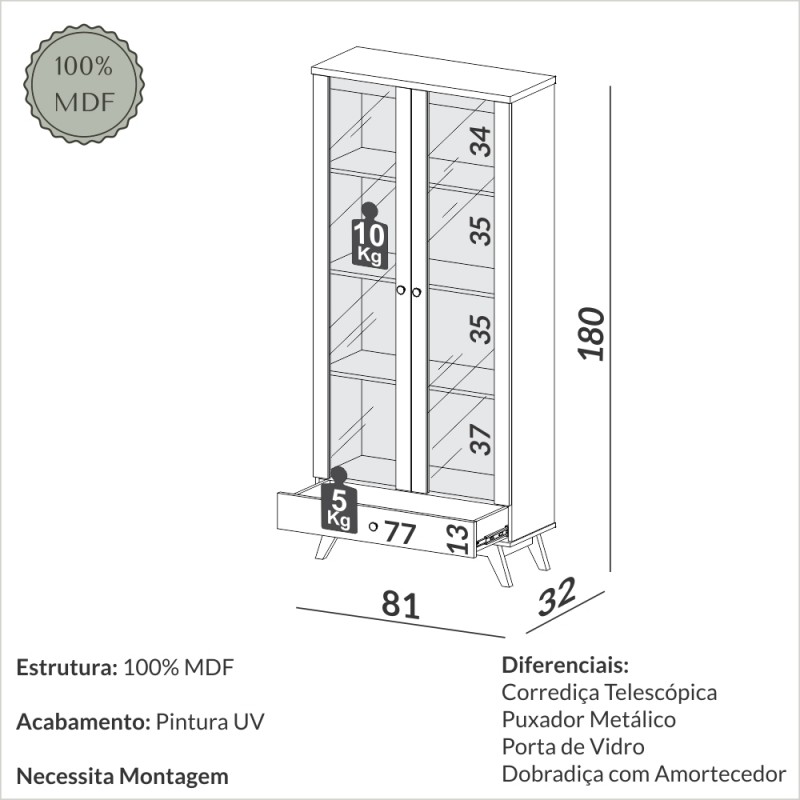 Esse produto 100% MDF possui 1 gaveta com puxador metálico, 2 portas de vidro temperado e corrediças telescópicas, que conferem uma maior resistência à peça. Espaçosa e versátil, essa estante possui pintura de 6 camadas de proteção, a alta qualidade do acabamento faz com que esse produto da Dalla Costa se destaque em qualquer espaço.