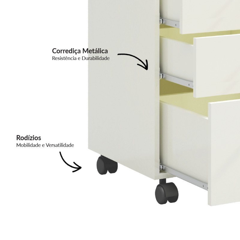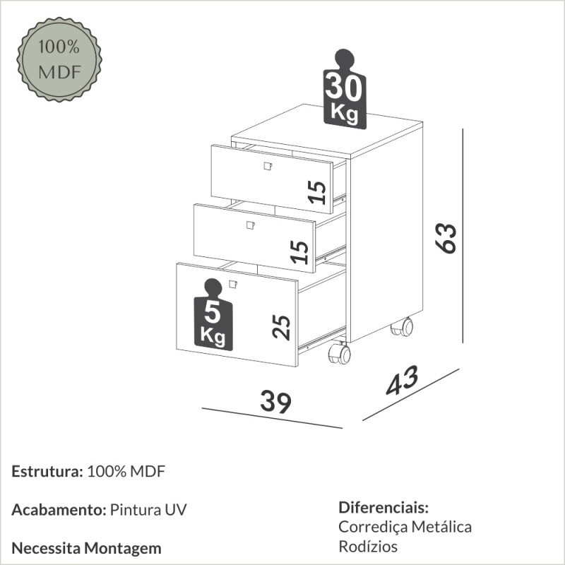 Esse produto 100% MDF possui 3 gavetas com corrediças metálicas. Com pintura de 6 camadas de proteção, a alta qualidade do acabamento faz com que esse gaveteiroseja bonito, funcional e se destaque em qualquer espaço.