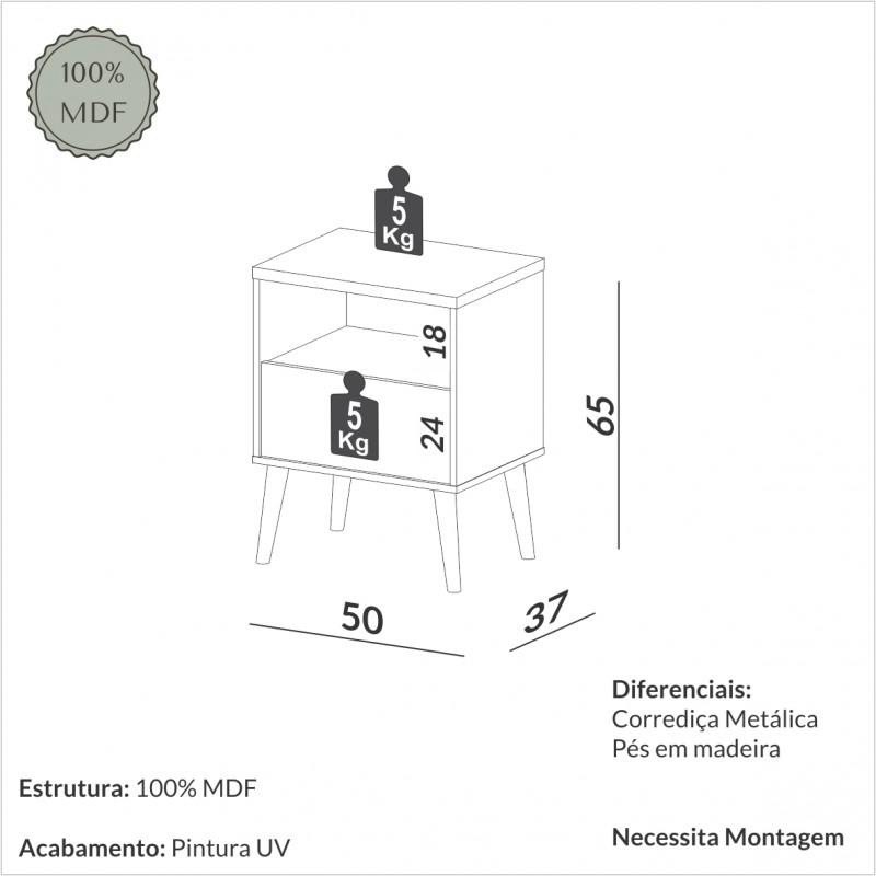 Pintura UV com 6 camadas de proteção e matérias primas de alta qualidade, fazem com que esse produto seja um acessório bonito e durável para a seu dormitório. A Mesa de Cabeceira Retrô conta com corpo 100% MDF e pés em madeira, que proporcionam um excelente acabamento e alta durabilidade. Esse acessório transmite aconchego para qualquer ambiente.