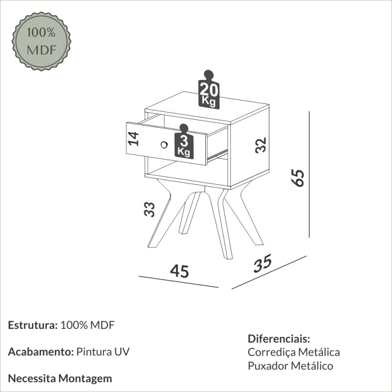 Pintura UV com 6 camadas de proteção e matérias primas de alta qualidade, fazem com que esse produto seja um acessório bonito e durável para a seu dormitório. A Mesa de Cabeceira Retrô conta com corpo e pés 100% MDF, que proporcionam um excelente acabamento e alta durabilidade. Esse acessório transmite aconchego para qualquer ambiente.