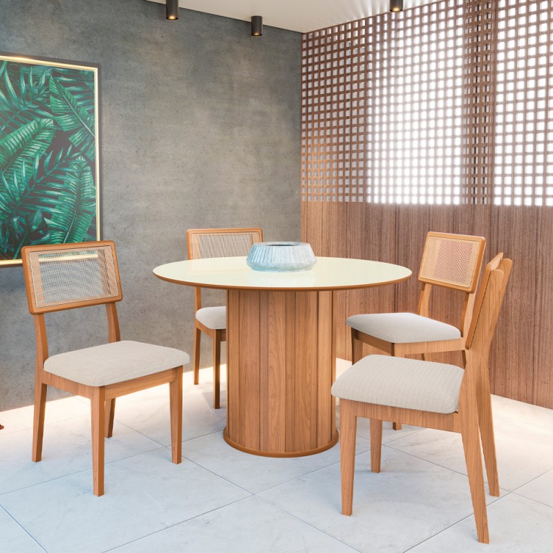 Ela acomoda até 6 lugares e é a combinação de um design moderno com delicadeza e qualidade. Sua estrutura 100% MDF garante a mais alta qualidade de acabamento para o produto. O design minimalista que dá a impressão de ripados sustentando um tampo robusto é construído a partir de ferragens com alta capacidade de sustentação. A base dos pés possui apliques de plástico na parte inferior, para aumentar a durabilidade da peça, mesmo com limpezas frequentes. As ripas dos pés dispostas em formato cônico e o tampo arredondado transmitem fluidez e são interessantes para lares com crianças agitadas. A alta qualidade do acabamento faz com que esse produto da Dalla Costa se destaque em qualquer espaço.