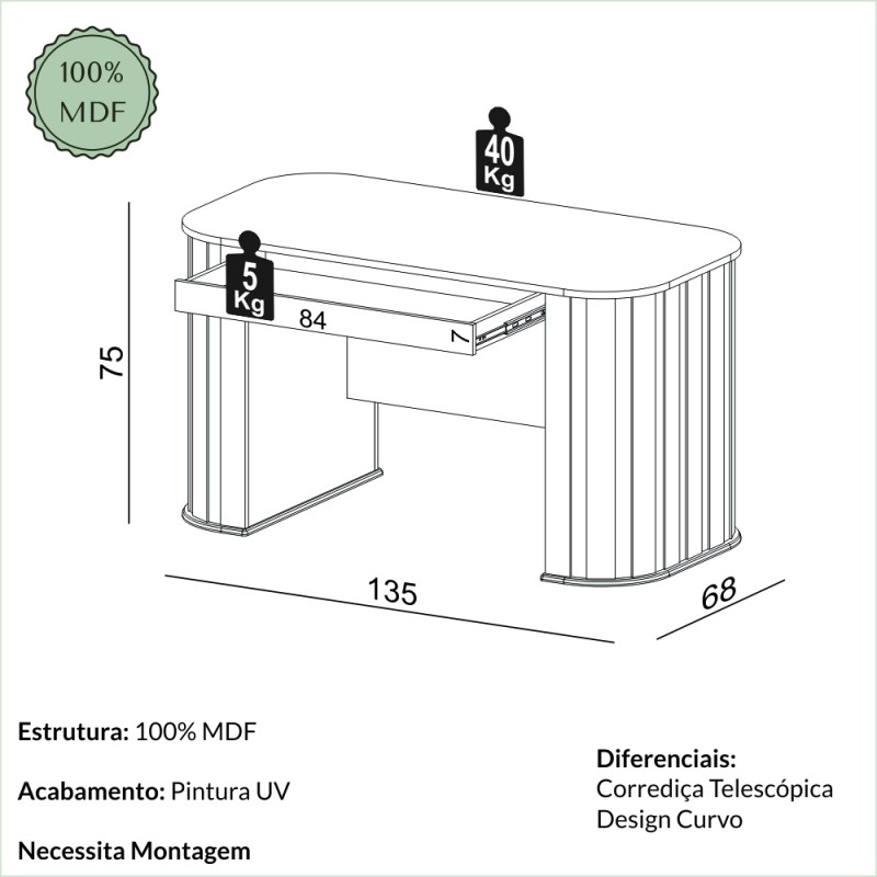 Esse produto 100% MDF possui design moderno com linhas curvas e ripados. Com pintura de 6 camadas de proteção, a alta qualidade do acabamento faz com que essa escrivaninha da Dalla Costa se destaque em qualquer espaço. Esse modelo possui 1 gaveta com corrediças telescópicas, o que confere uma maior durabilidade e resistência para a peça.