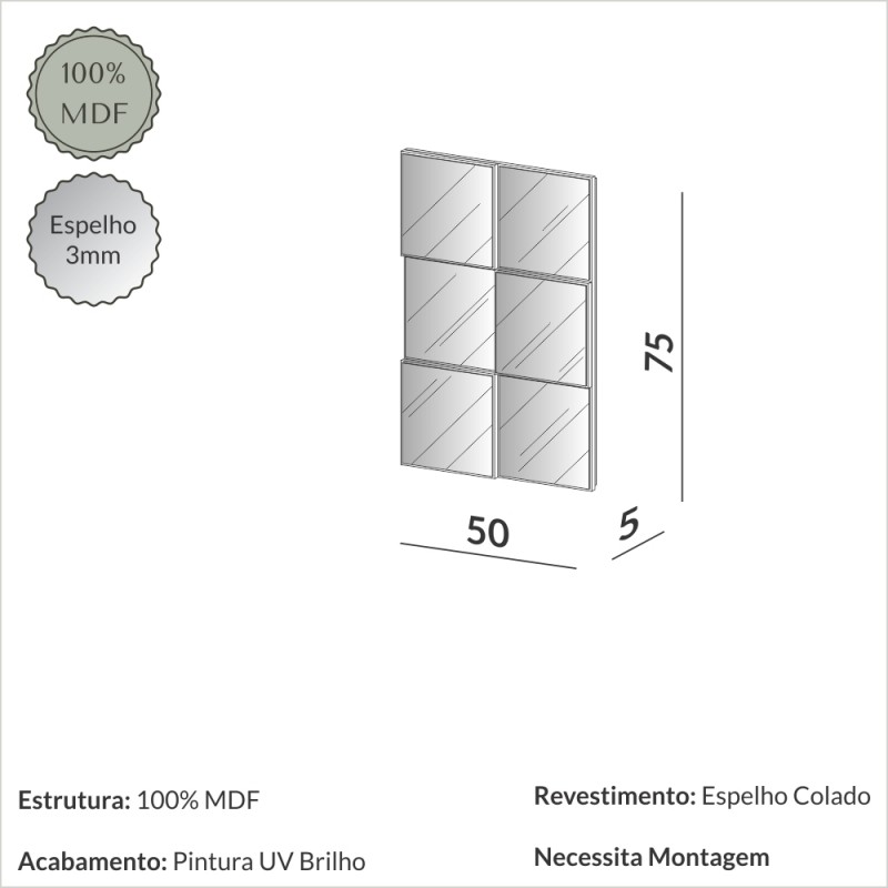 A peça é produzida 100% em MDF, com pintura de 6 camadas de proteção, o que confere alta qualidade de acabamento. O TB85 possui design quadriculado 3D e é uma peça chave para qualquer ambiente. Com proporções coringas, este espelho é destaque para qualquer ambiente e confere um design moderno para completar a decoração da sua casa com personalidade.