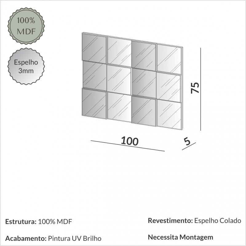 A peça é produzida 100% em MDF, com pintura de 6 camadas de proteção, o que confere alta qualidade de acabamento. O TB87 possui design quadriculado 3D e é uma peça chave para qualquer ambiente. Com proporções coringas, este espelho é destaque para qualquer ambiente e confere um design moderno para completar a decoração da sua casa com personalidade.