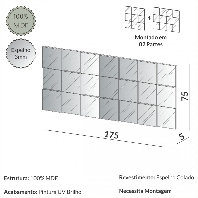 A peça é produzida 100% em MDF, com pintura de 6 camadas de proteção, o que confere alta qualidade de acabamento. O TB89 possui design quadriculado 3D e é uma peça chave para qualquer ambiente. Com proporções amplas, este espelho é destaque para qualquer ambiente e confere um design moderno para decorar a sua casa com muita personalidade.