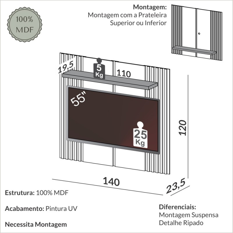 Esse produto 100% MDF possui uma prateleira para acomodar aparelhos eletrônicos.Bonito e versátil, esse painel suspenso acomoda uma TV de até 55 polegadas e tem design moderno. Com pintura de 6 camadas de proteção, a alta qualidade do acabamento faz com que esse produto da Dalla Costa se destaque em qualquer espaço.