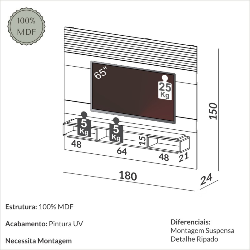 Esse produto 100% MDF possui três nichos para acomodar aparelhos eletrônicos.Bonito e versátil, esse painel suspenso acomoda uma TV de até 65 polegadas e tem design moderno. Com pintura de 6 camadas de proteção, a alta qualidade do acabamento faz com que esse produto da Dalla Costa se destaque em qualquer espaço.