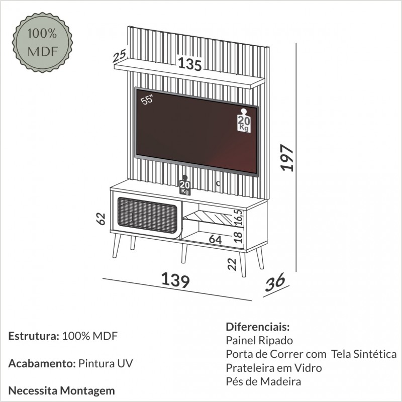 Com design minimalista e atemporal, o Kit Painel + Rack TB344 confere beleza e funcionalidade para qualquer sala de estar.