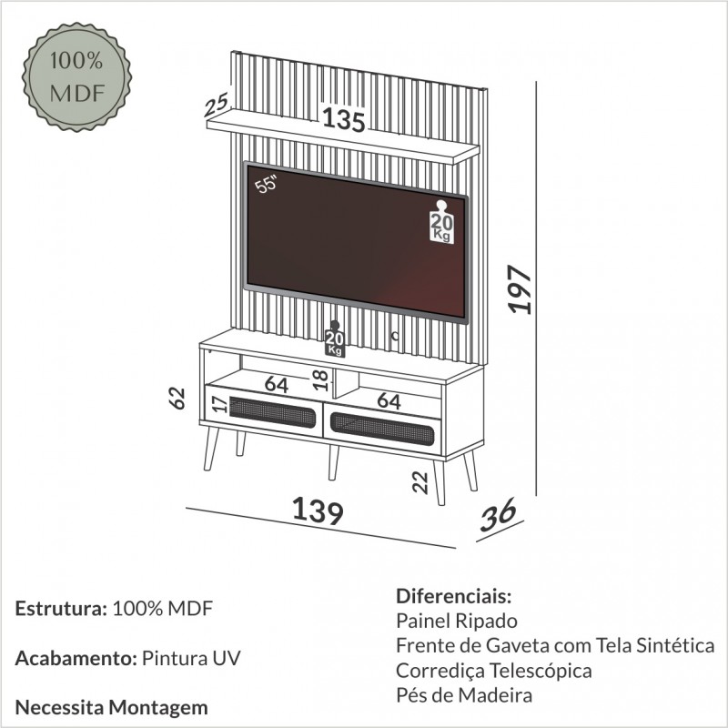 Esse produto 100% MDF possui pés em madeira, que proporcional durabilidade e sofisticação para o seu ambiente. Bonito e versátil, o painel ripado suspenso acomoda uma TV de até 55 polegadas e tem design moderno, em concordância com rack que possui duas gavetas com detalhes em palha sintética, que abrem espaços de armazenamento ideais para consoles e decorações. Com pintura de 6 camadas de proteção, a alta qualidade do acabamento faz com que esse produto da Dalla Costa se destaque em qualquer espaço.